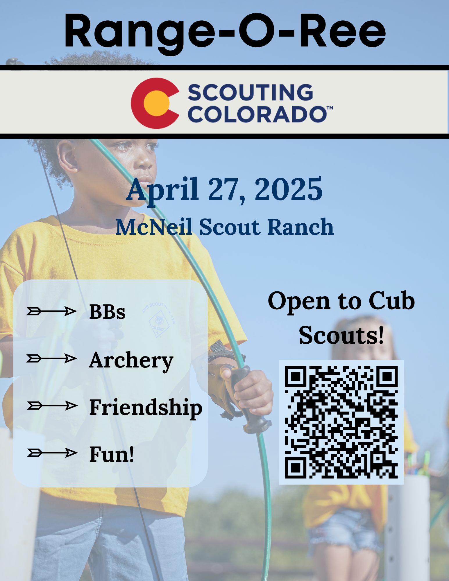 Hey Cub Scouts and Cub Scout Families! Joins us on Sunday, April 27th, 2025 from 10:00 am - 2:00 pm at Camp Cris Dobbins at the beautiful McNeil Scout Ranch for Range-O-Ree.